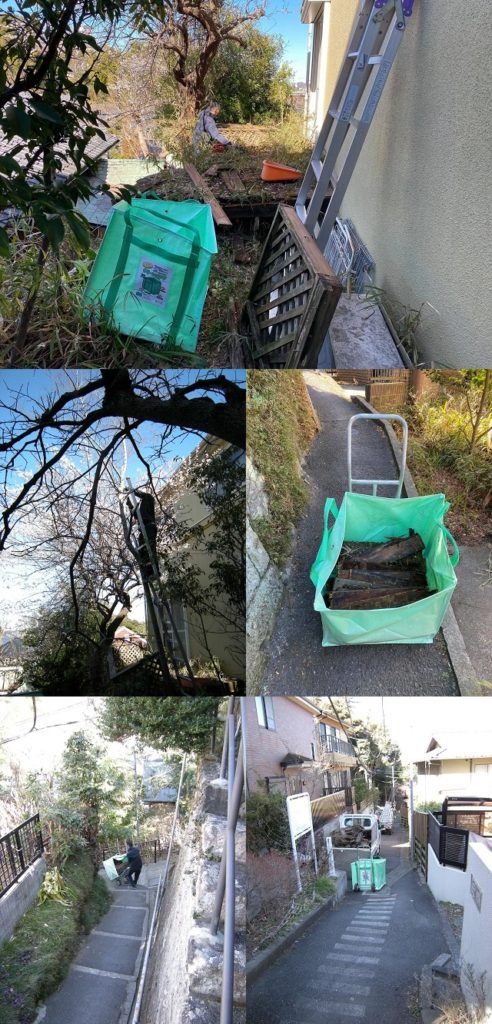 現場から車両までは段差のある50メートルでしたので、大袋と台車で運び出しました。